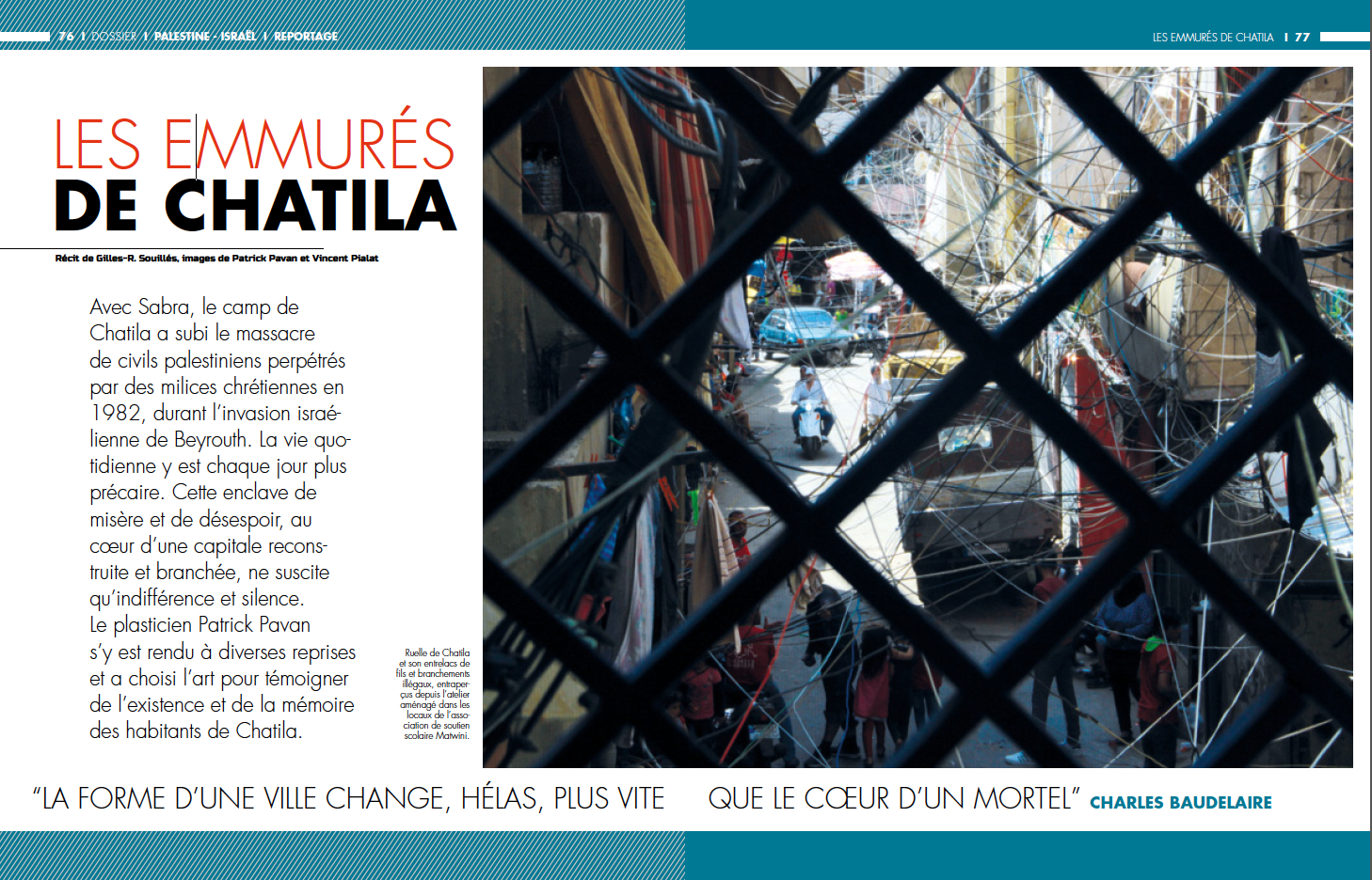 Reportage au camp de Chatila, enkysté au milieu de Beyrouth, îlot de modernité et de prospérité indécente dans un Proche-Orient en lambeaux. Rencontre avec ses habitants grâce au plasticien Patrick Pavan qui mène un travail aux côtés des enfants du camp palestinien.