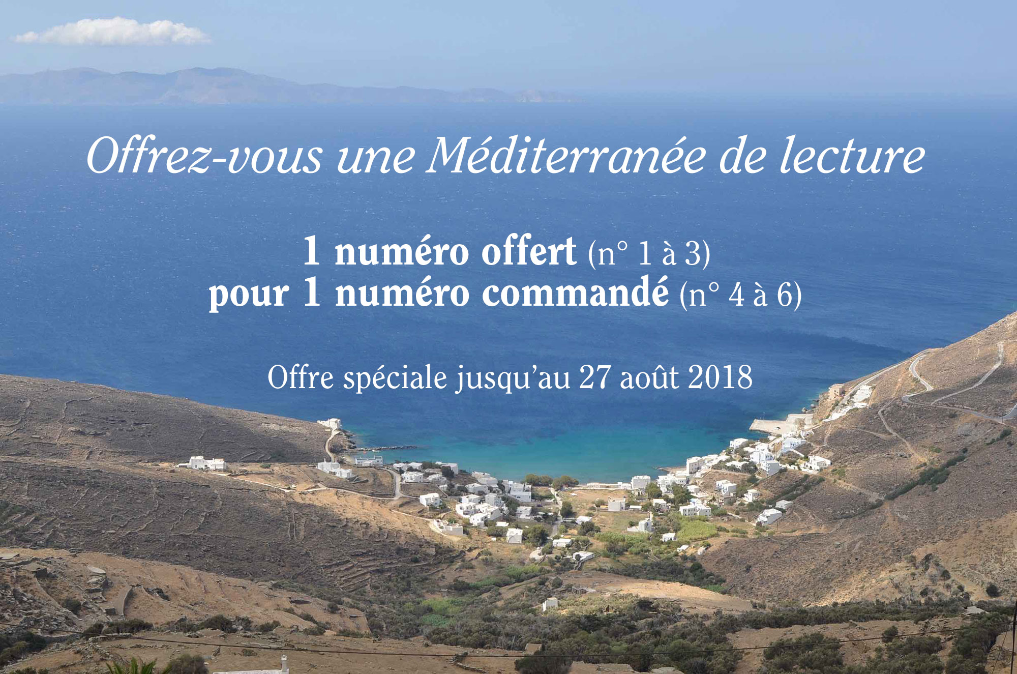 Avec six numéros parus qui racontent des histoires et des récits autour des mondes méditerranéens, profitez d’une offre spéciale jusqu’au 28 août. Pour tout numéro commandé (N° 4, 5 et 6), un deuxième numéro vous est offert (N° 1, 2 et 3 exclusivement). Indiquez simplement dans la fiche de commande à la rubrique « Commentaires« , votre choix du numéro gratuit que vous souhaitez recevoir ou envoyer à la personne de votre choix en indiquant la bonne adresse. Les frais de port sont toujours de 3 € quelque que soit le montant de votre commande.