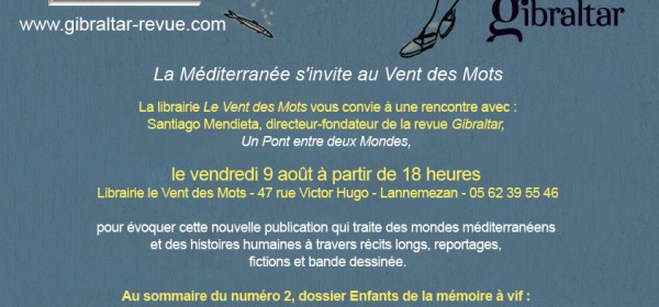 La Méditerranée et les mondes méditerranéens s’invitent à la librairie le Vent des Mots, à Lannemezan (65) le vendredi 9 août à 18 heures, 47 rue Victor-Hugo (centre-ville). Rencontre avec Santiago Mendieta, le directeur de la revue Gibraltar autour des thèmatiques traitées dans les deux numéros parus.