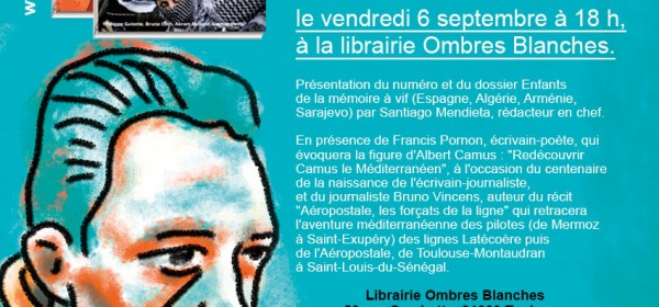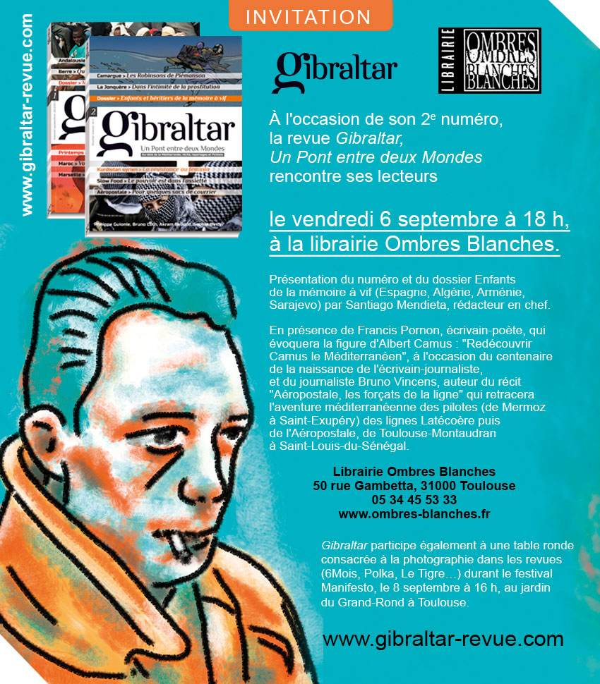 Gibraltar revient à la belle librairie Ombres Blanches à Toulouse le vendredi 6 septembre à 18 h pour présenter le numéro 2 de la revue avec Santiago Mendieta, directeur de la rédaction, Francis Pornon (écrivain) et Bruno Vicens (journaliste).