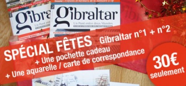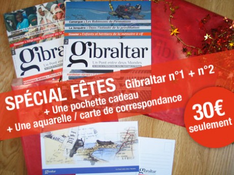 En attendant le prochain numéro à paraître début février 2014, Gibraltar vous propose une offre spéciale fêtes de fin d’année avec les deux premiers numéros de la revue à 30 € au lieu de 34 €, accompagné d’une pochette cadeau et d’une superbe carte de correspondance grand format (23,5 x 12,5 cm) sous la forme d’une aquarelle du rocher de Gibraltar survolé par un avion Latécoère (référence à notre récit paru dans le n° 2). Le port est compris.