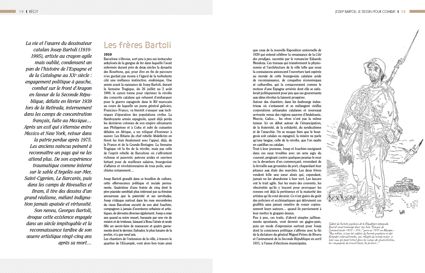 La vie et l’œuvre du dessinateur catalan Josep Bartoli (1910-1995), artiste au crayon agile mais oublié, condensent un pan de l’histoire de l’Espagne et de la Catalogne au XXesiècle : engagement politique à gauche, combat dans les milices sur le front d’Aragon en faveur de la Seconde République, défaite en février 1939 lors de la Retirada, internement dans les camps de concentration français, fuite au Mexique… Après un exil qui s’éternise entre Mexico et New York, retour dans la patrie perdue après 1975. Les anciens vaincus peinent à reconnaître un pays qui ne les attend plus. De son expérience traumatique comme interné sur le sable d’Argelès-sur-Mer, Saint-Cyprien, Le Barcarès, puis dans les camps de Rivesaltes et Bram, il tire des dessins d’un grand réalisme, mêlant indignation jamais apaisée et virtuosité. Son neveu, Georges Bartoli, évoque cette existence engagée dans un siècle impitoyable et la reconnaissance de son œuvre artistique vingt-cinq ans après sa mort…