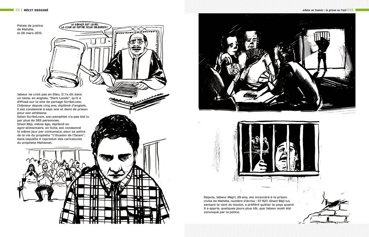 Les malheurs de Jabeur Mejri et l’acharnement de la justice tunisienne à son encontre se poursuivent. Le numéro 3 de Gibraltar a raconté son histoire en BD, un récit dessiné sur 31 pages de Sofiya Vosnaya avec un scénario du journaliste Thibaut Cavaillès avec talent et sensibilité.