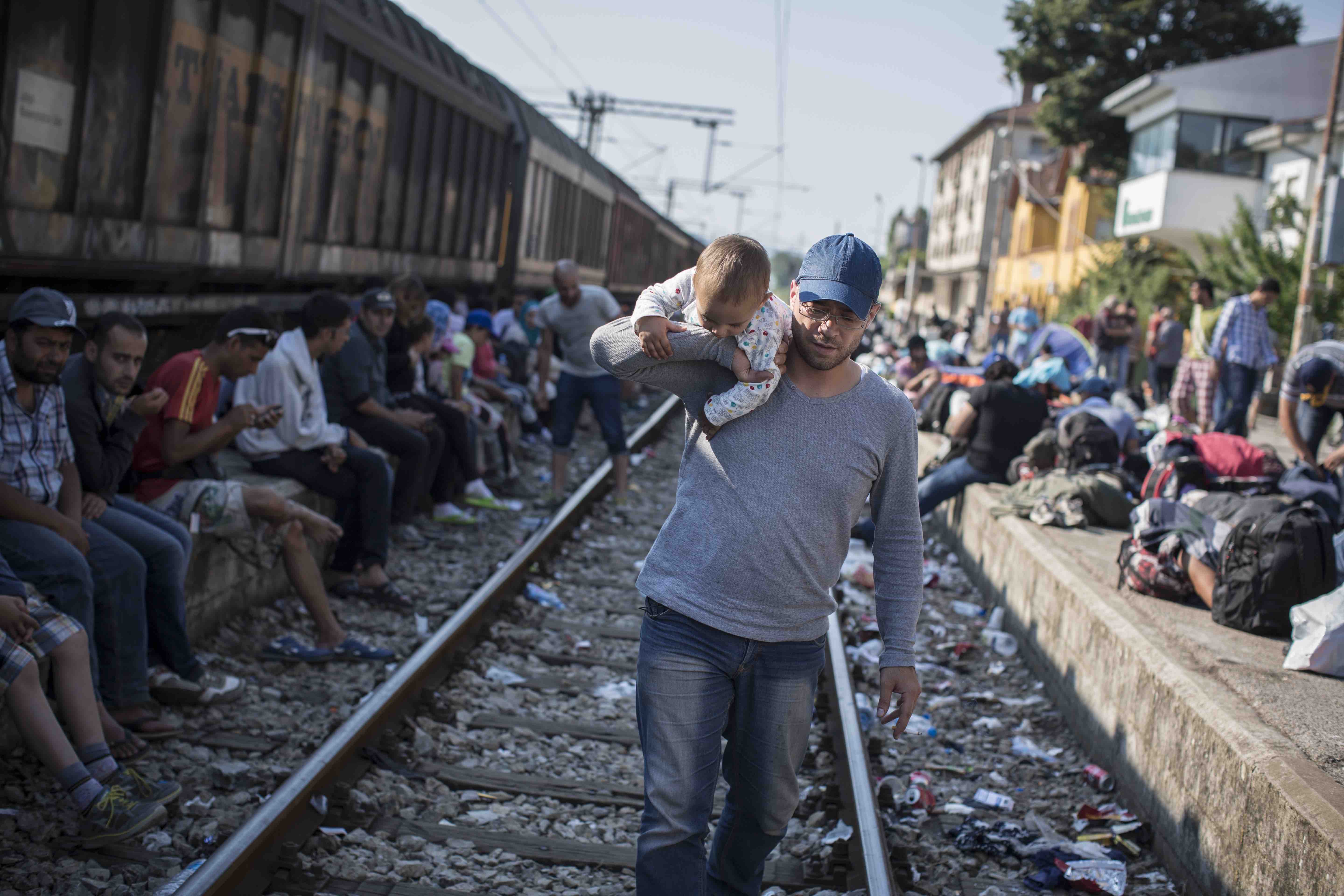 Sur les quais bondés de la gare de Gevgelia, Macédoine, été 2015, les réfugiés attendent un laissez-passer des autorités. Pour Ahmad, il est aussi l’heure de changer la couche de César…