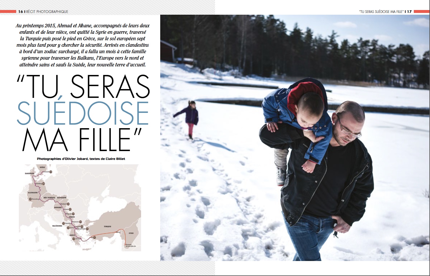 Gibraltar a publié sur 26 pages dans son numéro 6 le poignant voyage de Jihane et Ahmad fuyant la guerre en Syrie avec leurs enfants en 2015 pour trouver refuge en Suède, après 4 000 kilomètres de voyage en clandestins aux prises avec les passeurs. Cette histoire intitulée par les auteurs « Tu seras suédoise ma fille » y est documentée par le photographe Olivier Jobard et sa consœur Claire Billet pour le texte sous la forme d’un Récit photo. C’est également un magnifique documentaire, avec un titre identique, diffusé le 4 avril 2018 sur France 2 dans la case documentaire “25 nuances de doc”.