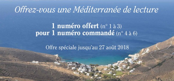 Avec six numéros parus qui racontent des histoires et des récits autour des mondes méditerranéens, profitez d’une offre spéciale jusqu’au 28 août. Pour tout numéro commandé (N° 4, 5 et 6), un deuxième numéro vous est offert (N° 1, 2 et 3 exclusivement). Indiquez simplement dans la fiche de commande à la rubrique « Commentaires« , votre choix du numéro gratuit que vous souhaitez recevoir ou envoyer à la personne de votre choix en indiquant la bonne adresse. Les frais de port sont toujours de 3 € quelque que soit le montant de votre commande.
