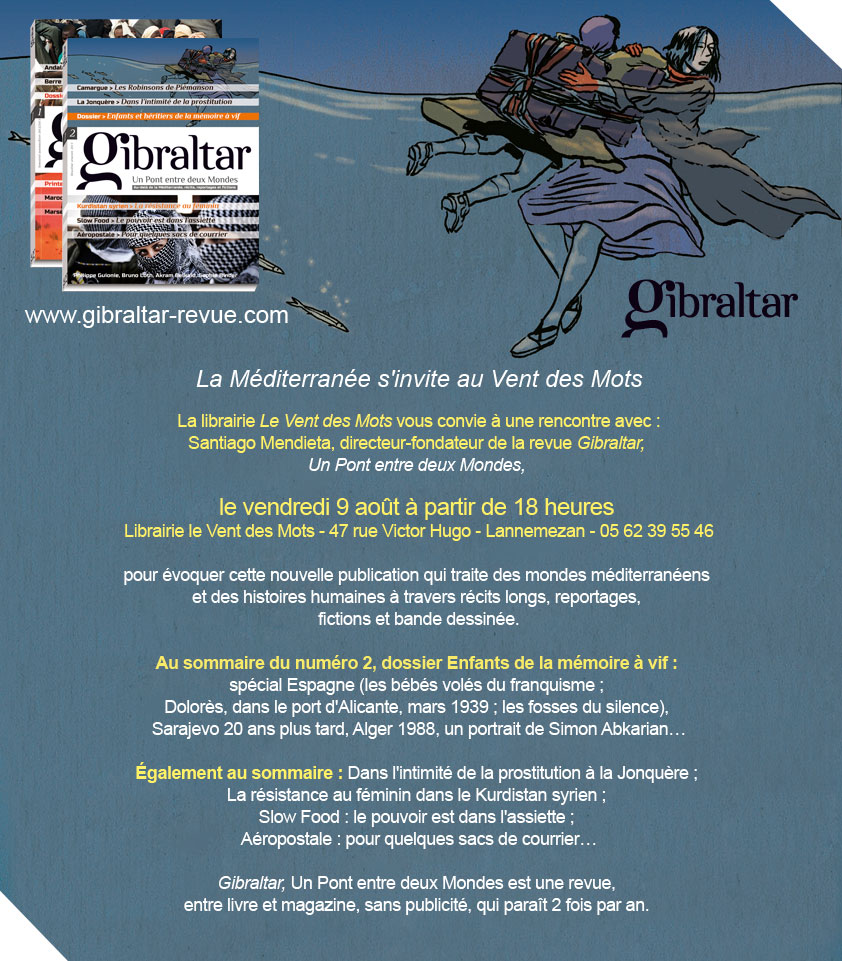 La Méditerranée et les mondes méditerranéens s’invitent à la librairie le Vent des Mots, à Lannemezan (65) le vendredi 9 août à 18 heures, 47 rue Victor-Hugo (centre-ville). Rencontre avec Santiago Mendieta, le directeur de la revue Gibraltar autour des thèmatiques traitées dans les deux numéros parus.