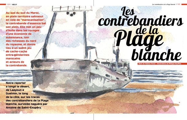 Notre reporter a longé le désert, de Laayoun à Guelmin, le long de la côte, sur les traces des contrebandiers de la Plage blanche, survolée naguère par Antoine de Saint-Exupéry.
