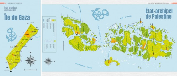 Essai et texte de François Beaune, carte-dépliant “L’archipel de Palestine” de Julien Boussac et carte “Terre promise, terre due” de Julien Dupont.