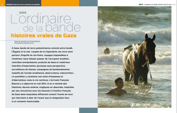 À Gaza, bande de terre palestinienne coincée entre Israël, l’Égypte et la mer, coupée de la Cisjordanie, les murs sont partout. Exiguïté du territoire, voyages impossibles à l’extérieur sans laissez-passer de l’occupant israélien, contrôles omniprésents, produits de base et matériaux interdits d’importation, jeunesse sans perspective, surveillance du Hamas, campagnes de bombardements massifs de l’armée israélienne, destructions, malnutrition… Le quotidien y constitue une suite d’impasses et d’aberrations, mais la vie continue. L’écrivain François Beaune y a séjourné en mai 2014. Il en a ramené des histoires, douces amères, tragiques ou absurdes, inspirées par ses rencontres avec les Gazouis à l’Institut français de Gaza dans lesquelles affleurent autant l’ironie de ceux qui cherchent à aller de l’avant que la résignation face à un contexte inextricable.