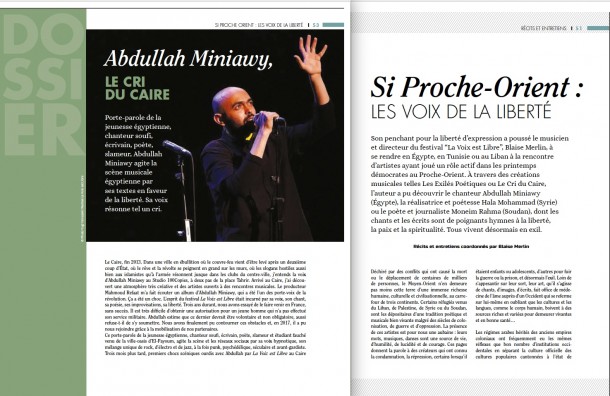 Son penchant pour la liberté d’expression a poussé le musicien et directeur du festival La Voix est Libre, Blaise Merlin, à se rendre en Égypte, en Tunisie ou au Liban à la rencontre d’artistes ayant joué un rôle actif dans les printemps démocrates au Proche-Orient. À travers des créations musicales telles Les Exilés Poétiques ouLe Cri du Caire, l’auteur a pu découvrir le chanteur Abdullah Miniawy (Égypte), la réalisatrice Hala Mohammad (Syrie) ou le poète et journaliste Moneim Rahma (Soudan), dont les chants et les écrits sont de poignants hymnes à la liberté, la paix et la spiritualité. Tous vivent désormais en exil.