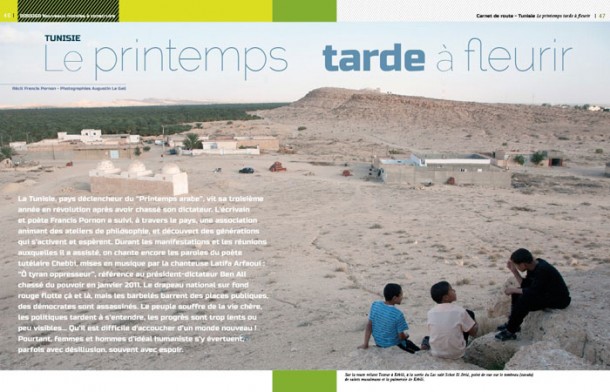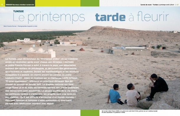 La Tunisie, pays déclencheur du “Printemps arabe”, vit sa troisième année en révolution après avoir chassé son dictateur. L’écrivain et poète Francis Pornon a suivi, à travers le pays, une association animant des ateliers de philosophie, et découvert des générations qui s’activent et espèrent. Durant les manifestations et les réunions auxquelles il a assisté, on chante encore les paroles du poète tutélaire Chebbi, mises en musique par la chanteuse Latifa Arfaoui : “Ô tyran oppresseur”, référence au président-dictateur Ben Ali chassé du pouvoir en janvier 2011. Le drapeau national sur fond rouge flotte çà et là, mais les barbelés barrent des places publiques, des démocrates sont assassinés. Le peuple souffre de la vie chère, les politiques tardent à s’entendre, les progrès sont trop lents ou peu visibles… Qu’il est difficile d’accoucher d’un monde nouveau ! Pourtant, femmes et hommes d’idéal humaniste s’y évertuent, parfois avec désillusion, souvent avec espoir.